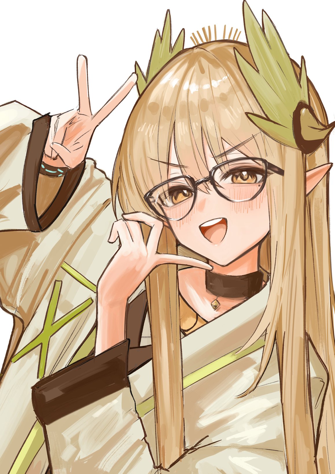 :d1girlbespectacledblack chokerblack-framed eyewearblushbrown eyesbrown hairchokercoatdouble velfglassesgrey coathands uplaurel crownlong hairlooking at vieweropen mouthpointy earsportraitsimple backgroundsmilesoloteethupper teeth onlyvv-shaped eyebrowswhite backgroundwide sleeves