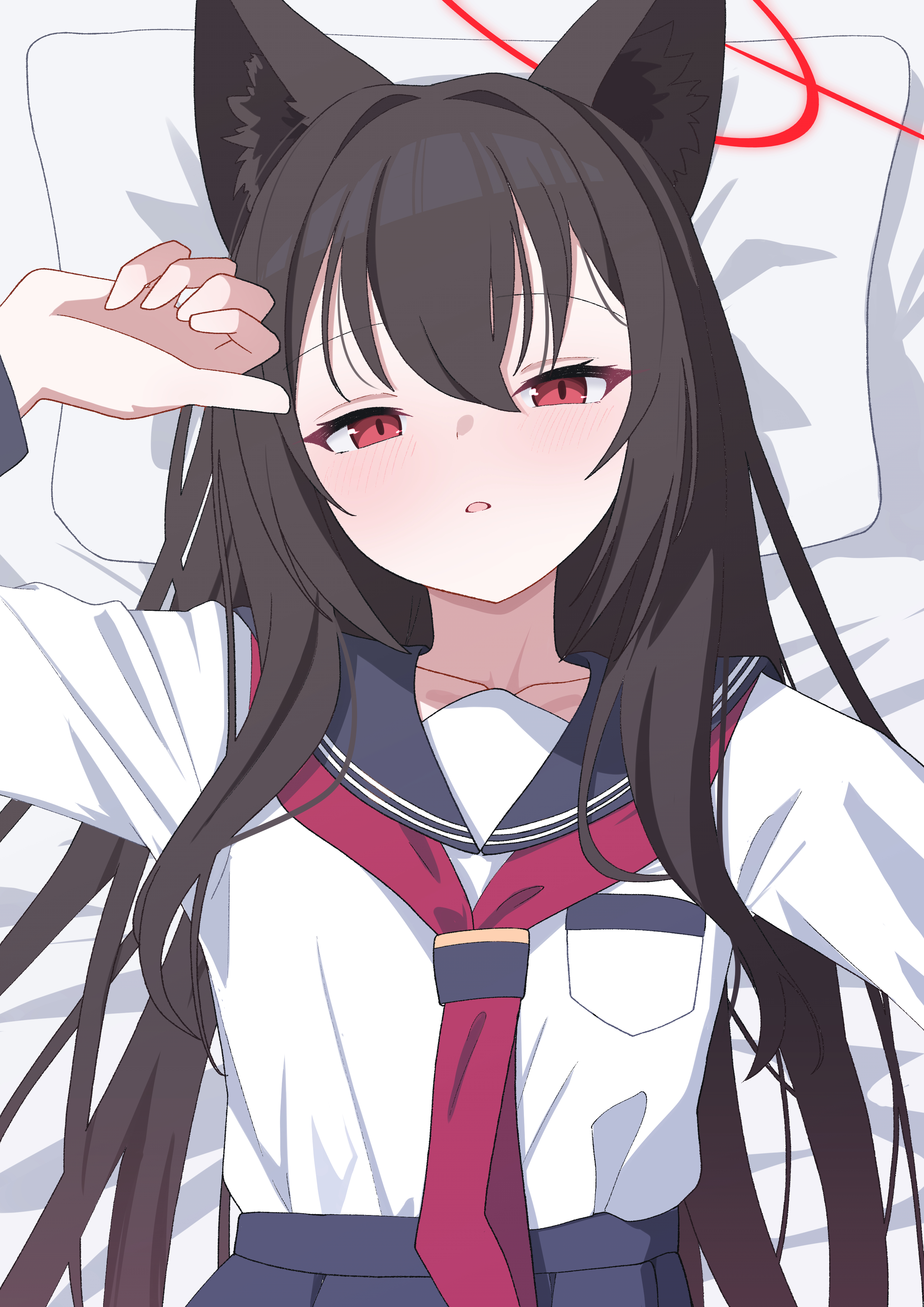 1girlanimal ear fluffanimal earsblack sailor collarblushbrown haircollarbonefox earsfox girlhair between eyeshair intakeshairbandhand uphead on pillowlong hairlong sleeveslooking at viewerlyingneckerchiefon backon bedopen mouthpillowred eyesred hairbandred neckerchiefsailor collarschool uniformserafukushirtsimple backgroundsoloupper bodyvery long hairwhite backgroundwhite shirt