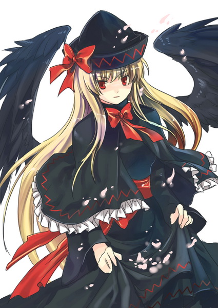 1girlblack wingsblonde haircapeletfemale focushatlight smilelong hairpetalsred eyesskirt basketsolowings