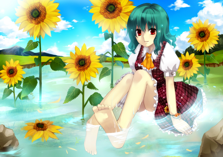 1girlascotbad anatomybad feetbarefootfeetfemale focusflowerfoot focusgreen hairpetalsplaid clothesplaid skirtplaid vestpoorly drawnred eyesshort hairskirtskirt setsolosunflowervestwater