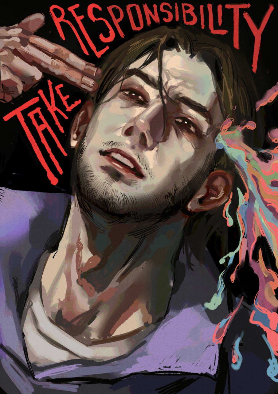 1boybags under eyesbeard stubbleblack eyesblank starebloodblood splatterbrown hairenglish textfacial hairfinger gunfinger gun to headhair slicked backhand uphead tiltmale focusrainbow bloodshirtshort hairsolostubblesuicidewhite shirt