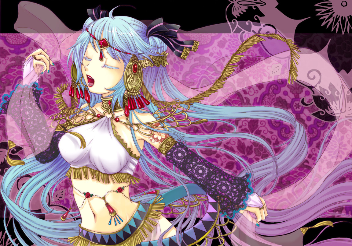 1girlaqua hairbridal gauntletschokerdetached sleevesearringseyelashesfemale focushair ribbonjewelrylipsticklong hairmakeupmidriffmusicnavelribbonsingingsolotwintailsvery long hair