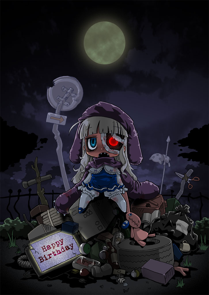 1girlaqua eyesbandage over one eyebandagesbloodchibicrazy eyesdressfemale focusfull moonglowingglowing eyehatheterochromiahoodlong hairmoonpantyhosered eyesskirtsolozombie