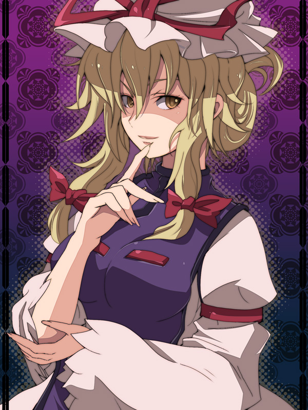 1girlblonde hairbrown eyesfemale focusfinger to mouthhatlong sleeveslooking at viewermob capshaded faceshort hairsolotabardupper bodywavy hair