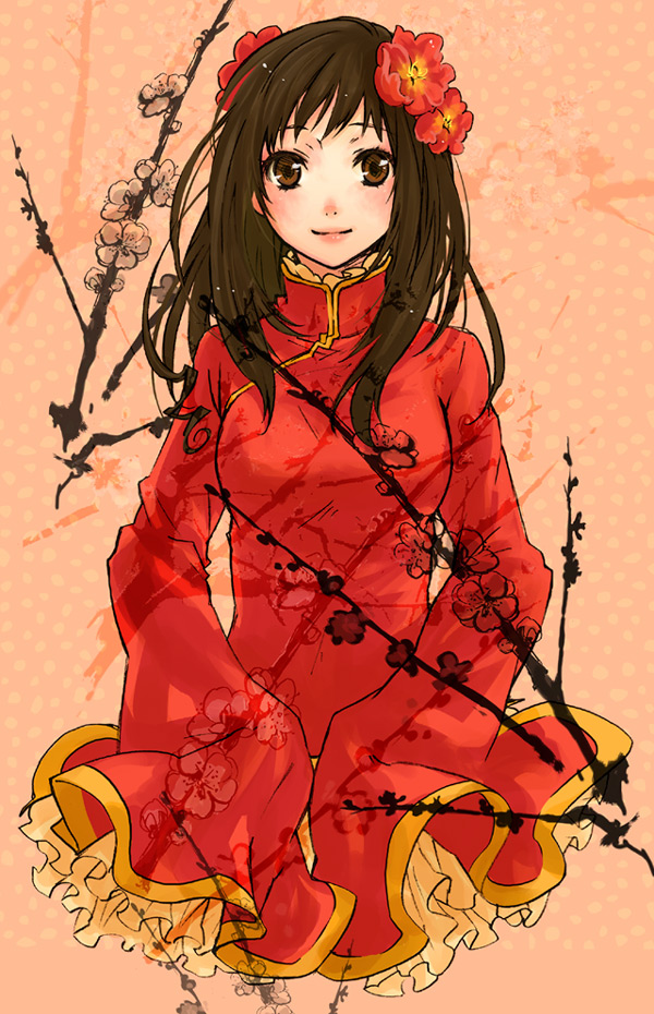 00s1girlblushbrown eyesbrown hairchangpaochina dresschinese clothesdressfemale focusflowerfrillshair flowerhair ornamentlipslong hairlong sleevesplum blossomssleeves past wristssolo