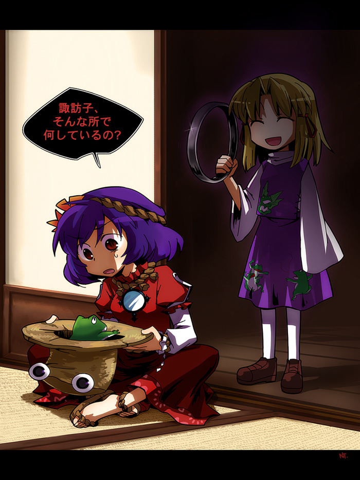 1boy2girlsblonde hairblue hairclosed eyesfemale focusfroghair ornamenthatleaf hair ornamentletterboxedmoriya's iron ringsmultiple girlsno nosepurple hairred eyesropesandalsshort hairsweatdropunworn hatunworn headwear
