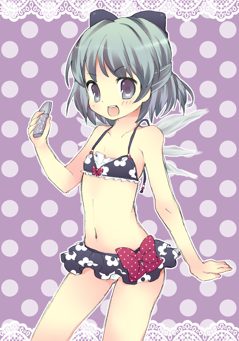 1girlbikiniblue eyesblue hairbowfemale focusflat chestgrey hairhair bowmatching hair/eyesnavelpolka dotpolka dot backgroundribbonshort hairsimple backgroundsoloswimsuit