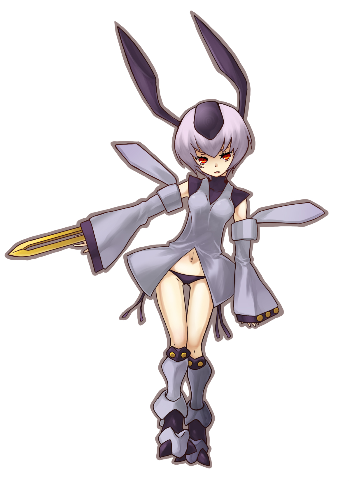 1girlbootsfemale focusgenderswapmecha musumepantiespersonificationpurple hairred eyesside-tie pantiessoloswordunderwearweapon