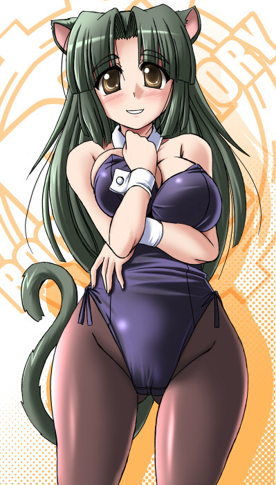 1girlanimal earsblushbreastsbreasts squeezed togetherbrown eyescat earscat tailcollardetached collarfemale focusgreen hairkittysuitlarge breastsnontraditional playboy bunnypantyhosesolotailwrist cuffs