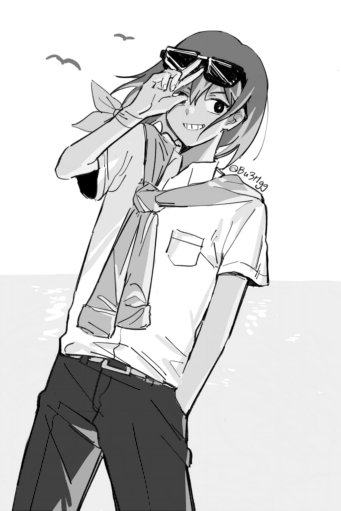 1boyalternate costumearm upbeltbirdbreast pocketbright pupilscollared shirtdark skindark-skinned maleeyewear on headgreyscalegrinhand in pocketmale focusmonochromepantspocketshirtshort sleevessmilesolosunglassesteeth