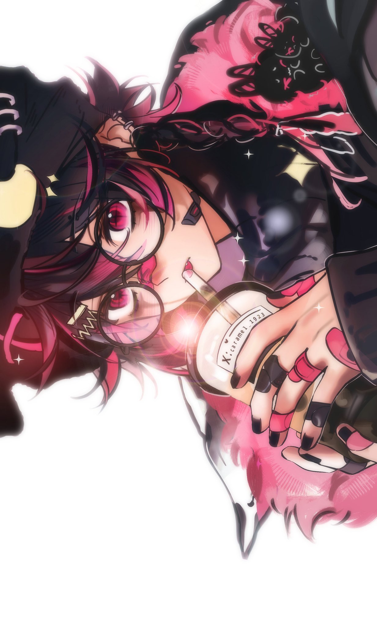 1boybandaidbandaid on facebandaid on handblack nailsblack-framed eyewearbraidcaramel 1923cupdrinking strawglassesholdingholding cupmulticolored hairpink eyestonguevirtual youtuberwhite background