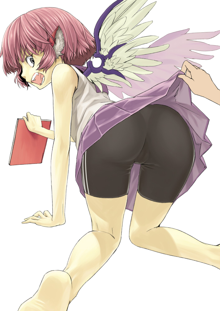 1girlall foursalternate costumeangryanimal earsassbarefootbike shortscameltoeclothes liftcontemporaryfangsfemale focuslooking backpink hairpleated skirtshort hairsimple backgroundskirtskirt liftsolowhite backgroundwings