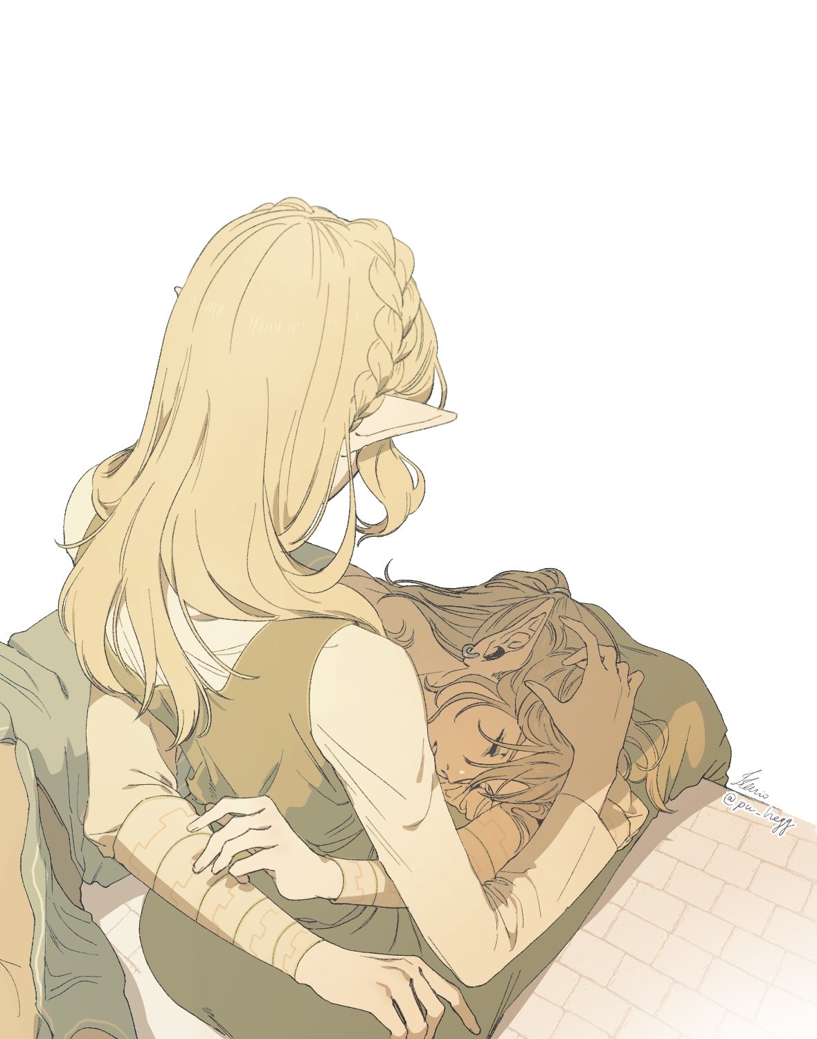 1boy1girlarms around waistblonde hairbraidbrown dressclosed eyescouplecrown braiddressearringsfrom abovehair between eyeshair tiehand in another's hairheterohugjewelrylap pillowlong hairlooking at anotherparted lipspointy earsponytailshirtshirt under dresssidelockssignaturesittingtunictwitter usernamewhite backgroundwhite shirt