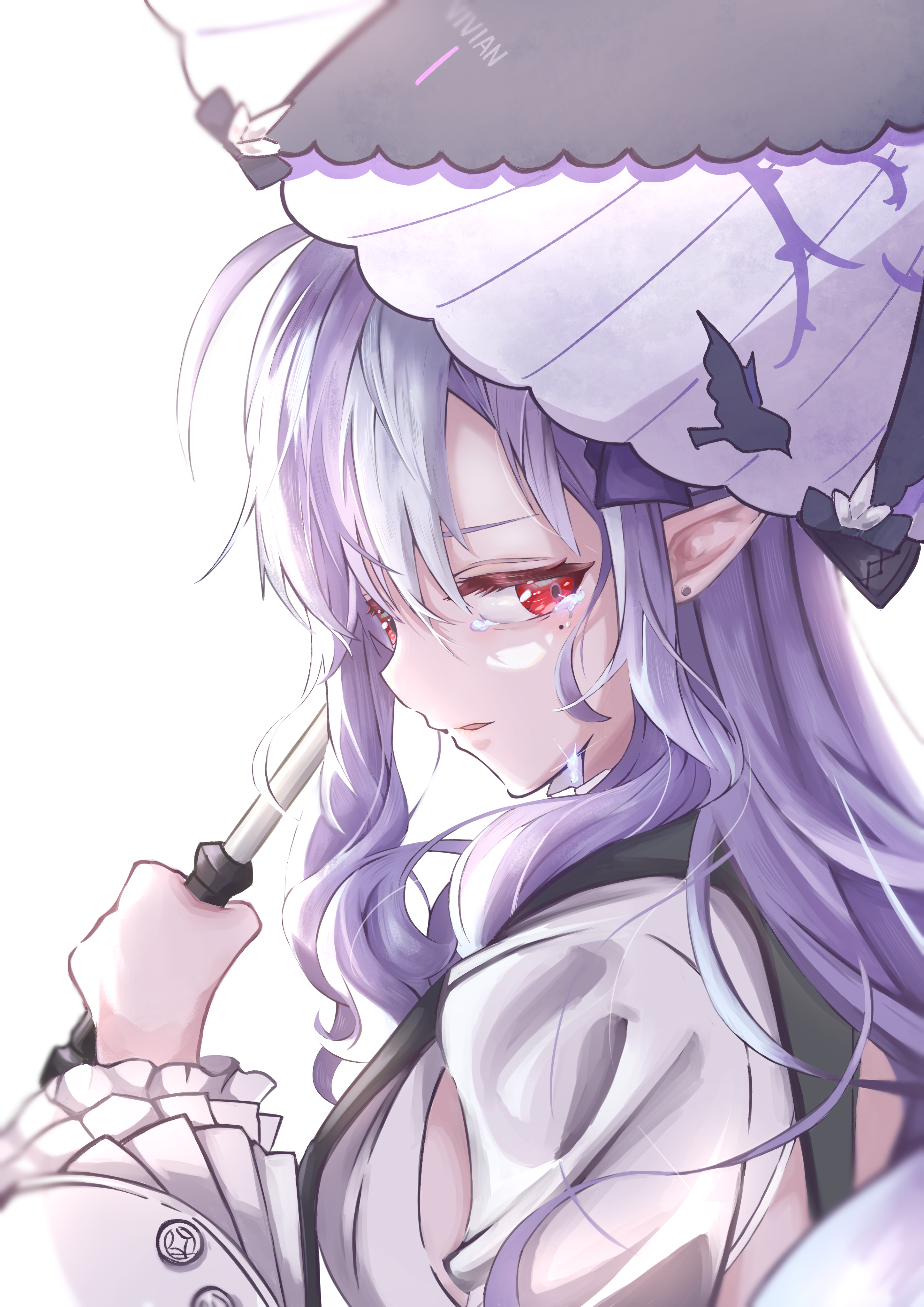 1girlbreast curtainsbreastscryingcrying with eyes openearringsfrilled sleevesfrillsfrom sidehair between eyeshairbandhalf-closed eyesholdingholding umbrellajewelrylong hairlooking to the sidemedium breastsmolemole under eyeopen mouthpointy earspurple hairpurple hairbandpurple umbrellared eyesshrug (clothing)sideboob cutoutsideways glancesimple backgroundsolotearsumbrellawhite backgroundwhite shrug