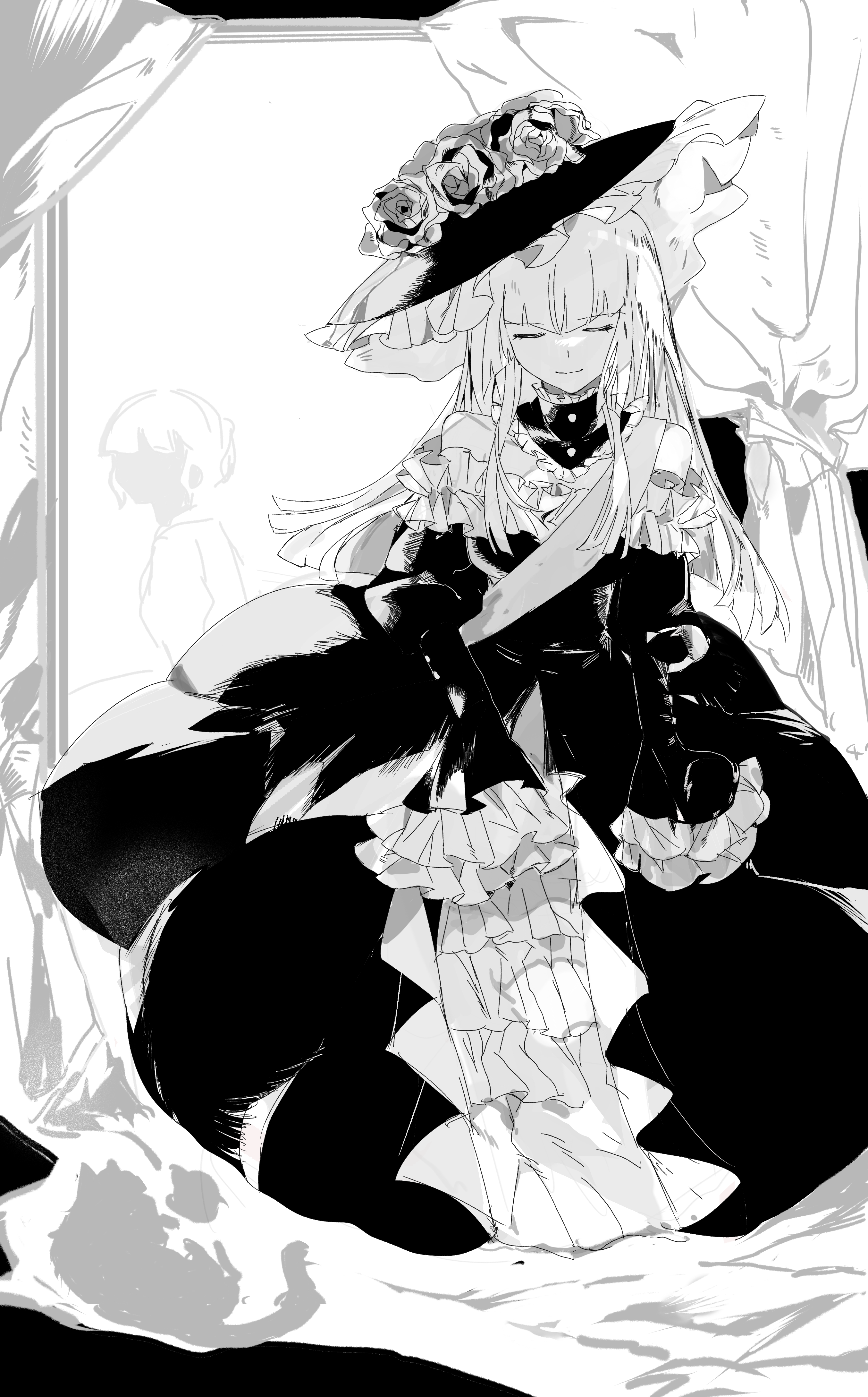 1girlblunt bangsblunt endsblunt sidelockschokerclosed eyesdressfacing viewerfloating clothesfloating hairflowerfrilled chokerfrilled dressfrilled hatfrilled sleevesfrillsfull bodygreyscalehathat flowerhime cutlight smilelong hairlong sidelocksmonochromeoff shouldersidelockssleeves past fingerssleeves past wristssolov-bangswide sleeveswitch hatxiangtangrubei
