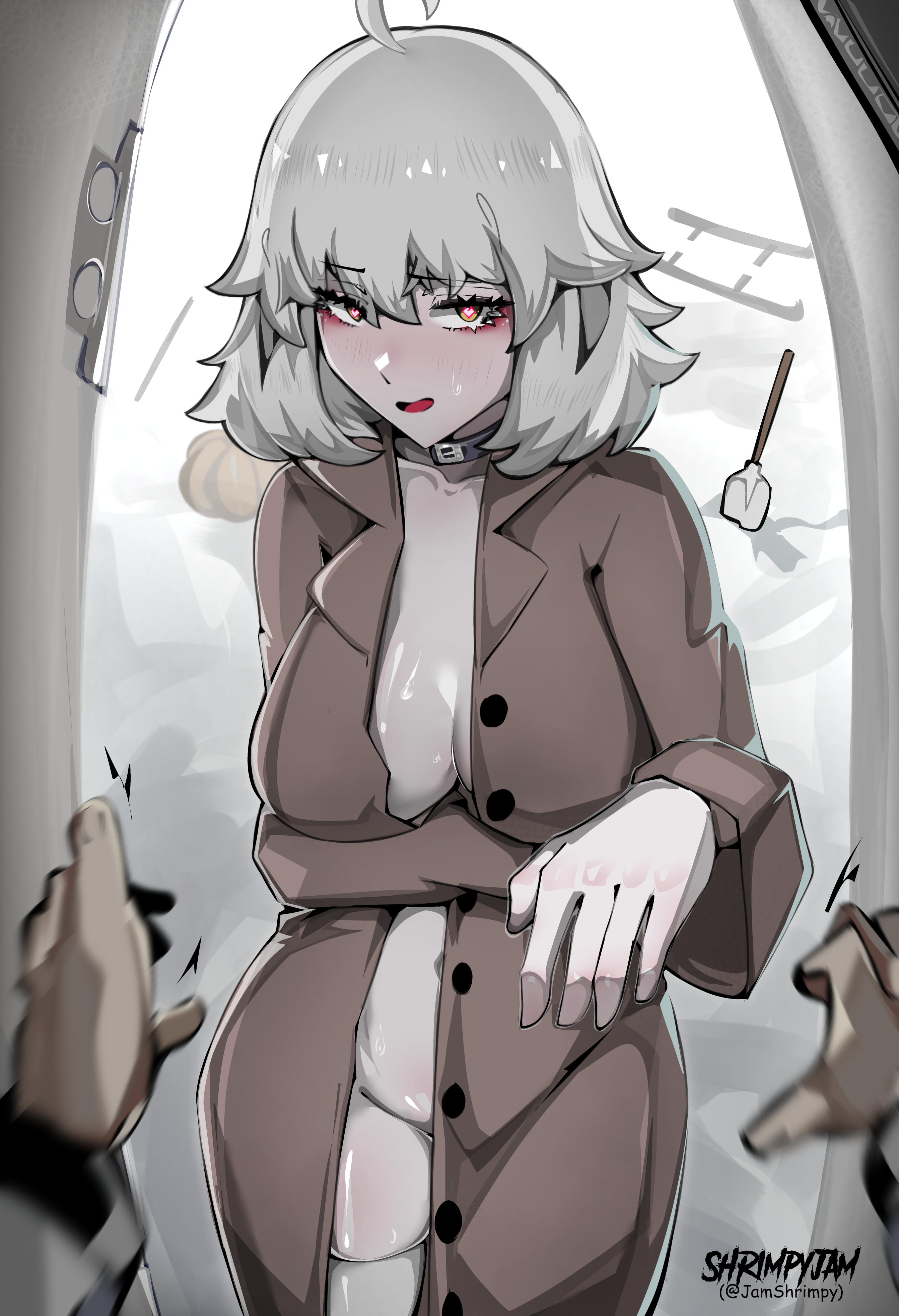 1boy1girlahogeblushbreastsbrown coatcoatheartheart in eyelarge breastslooking at viewermedium hairsnowsweatsymbol in eyethighhighstwitter usernamewhite hairwhite thighhighs