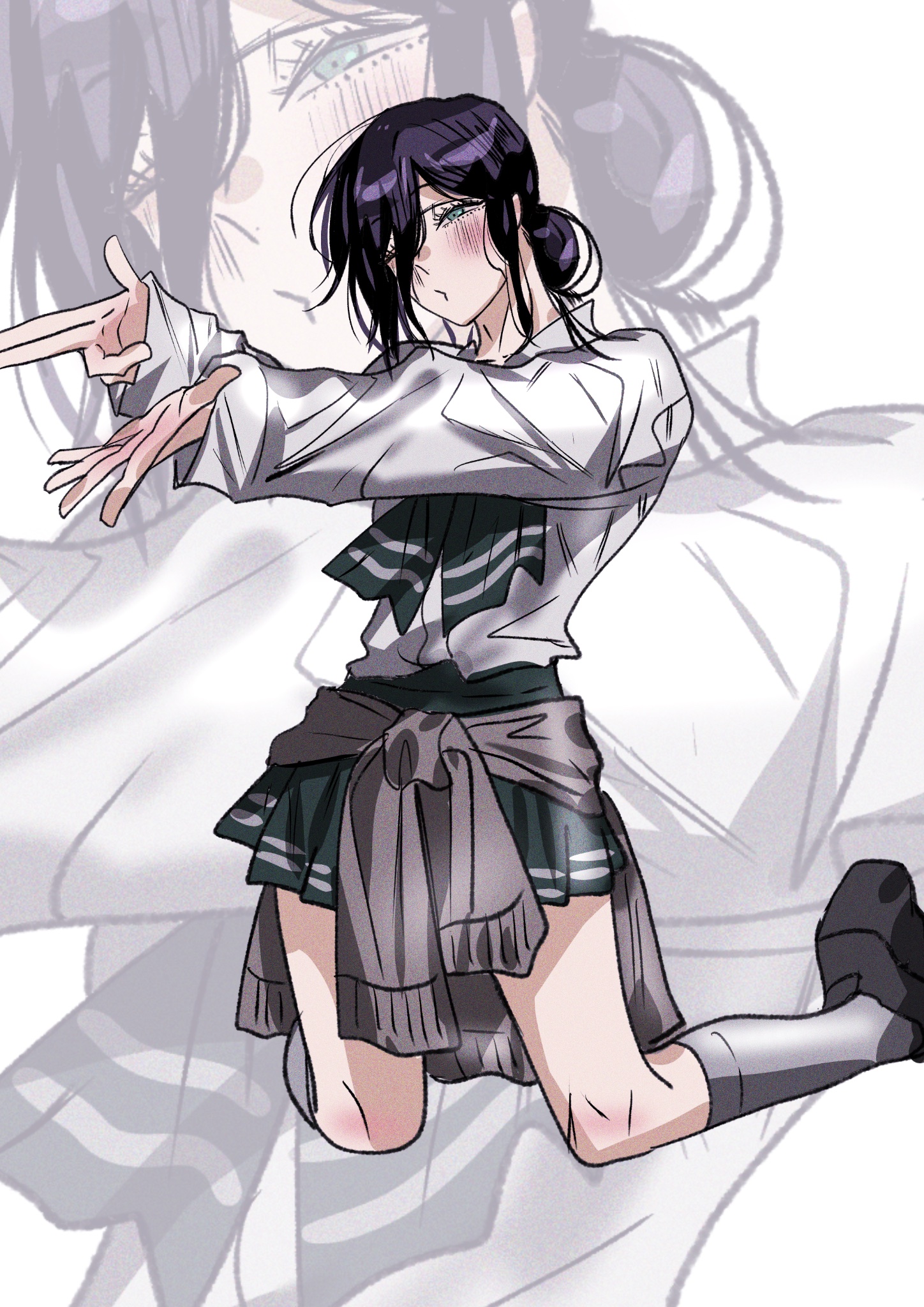 1girlblack skirtblushbusutttcardigancardigan around waistclothes around waistgreen eyesgrey cardigangrey sockshair bunkneelinglong sleeveslooking at viewermedium hairoutstretched armspuckered lipspurple hairshirtskirtsockssolowhite shirtzoom layer