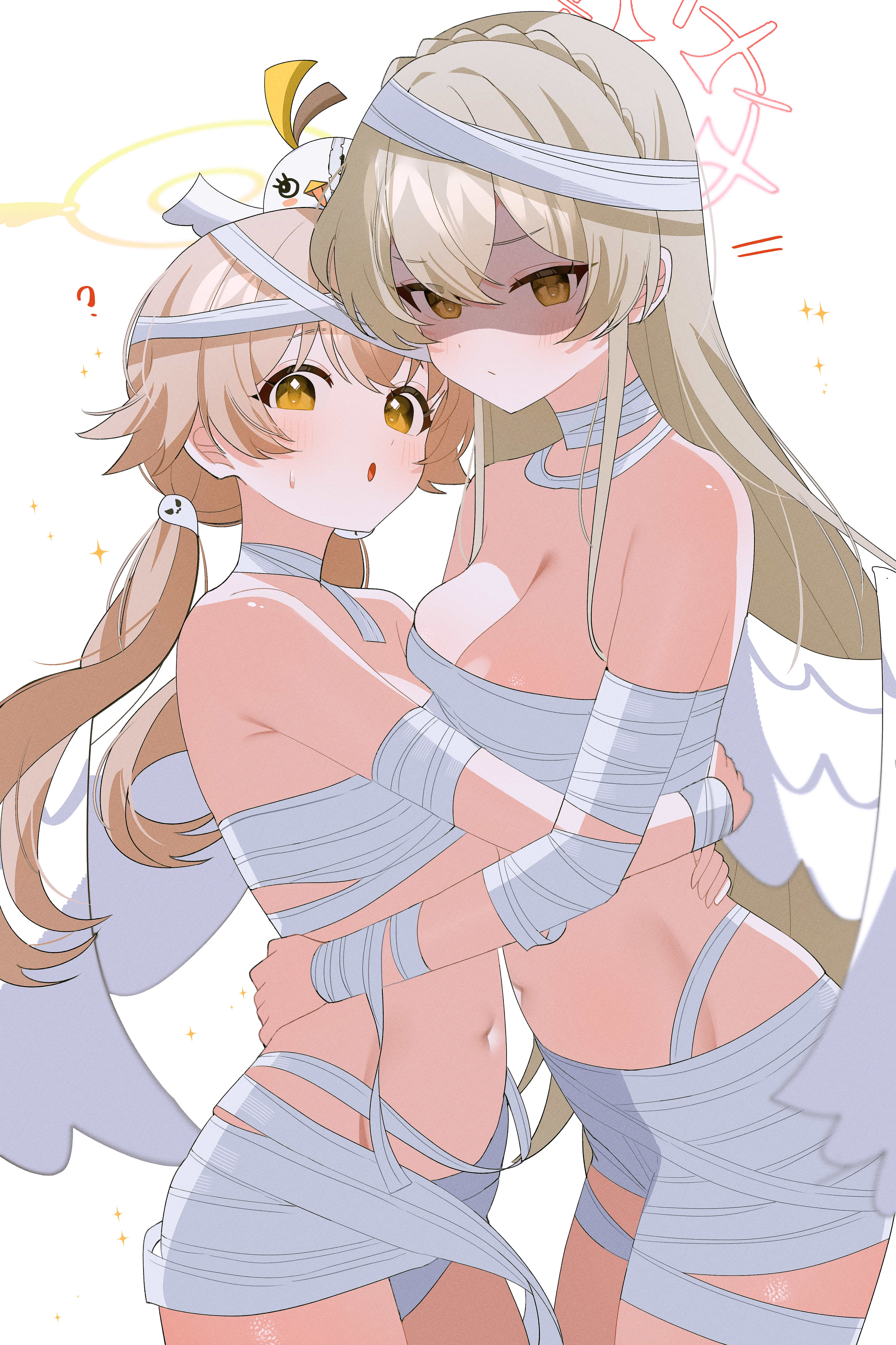 1boy2girlsasymmetrical dockingbandaged armbandaged headbandaged neckbandagesblonde hairbraidbreast pressbreastsbrown eyesbrown haircleavagecrown braiddouble-parted bangsflat chesthair between eyeshalohuglarge breastslong hairlooking at viewerlow twintailsmultiple girlsnaked bandagenavelopen mouthred haloshaded facesimple backgroundsmall breastsstomachtwintailswhite backgroundyellow eyesyellow halo