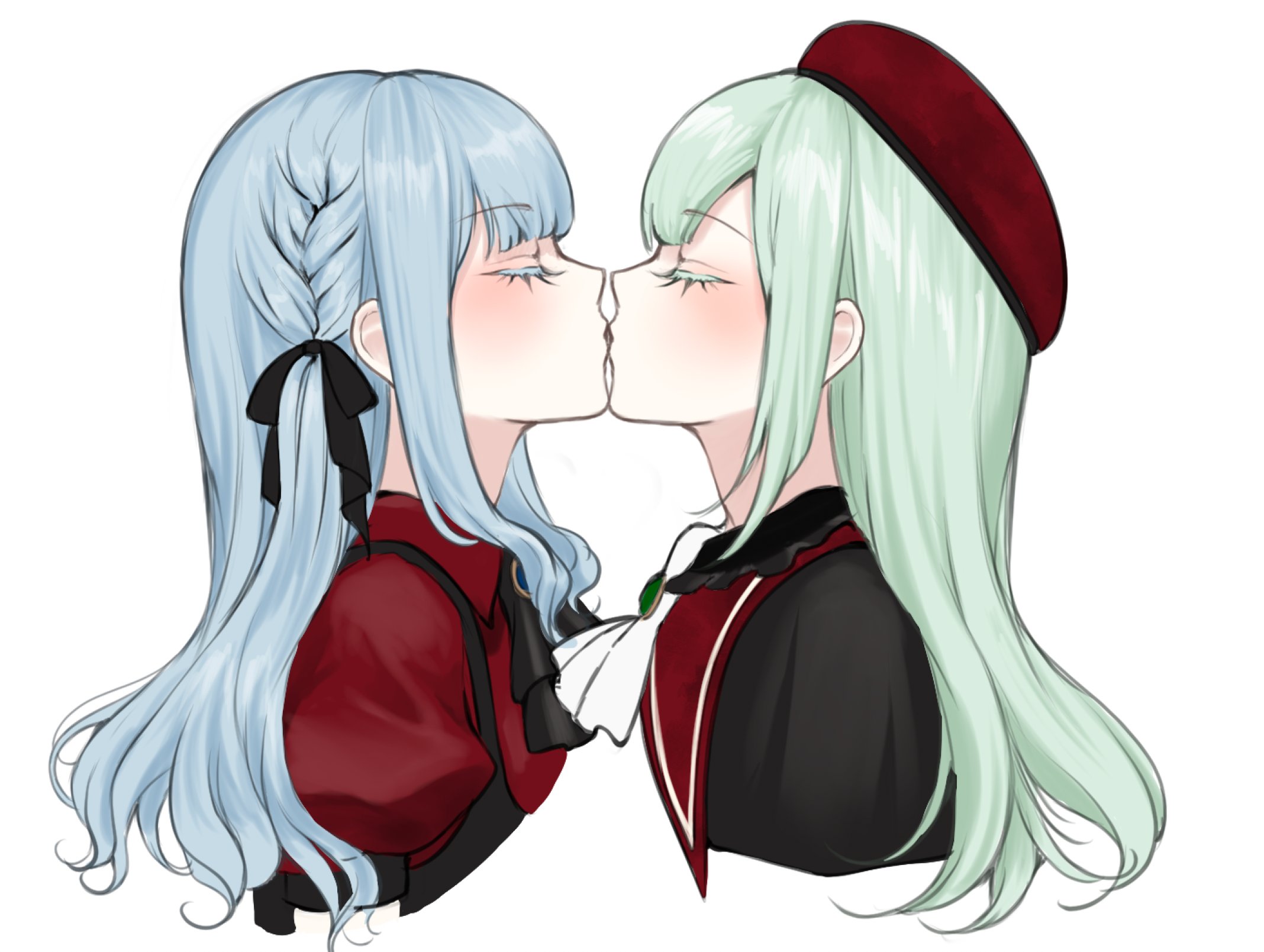 2girlsblack capeletblack ribbonblue haircapeletclosed eyescollared shirtgreen hairhair ribbonhatkisslong hairmultiple girlsred hatred shirtribbonshirtsimple backgroundtwo side upupper bodywhite backgroundyuri