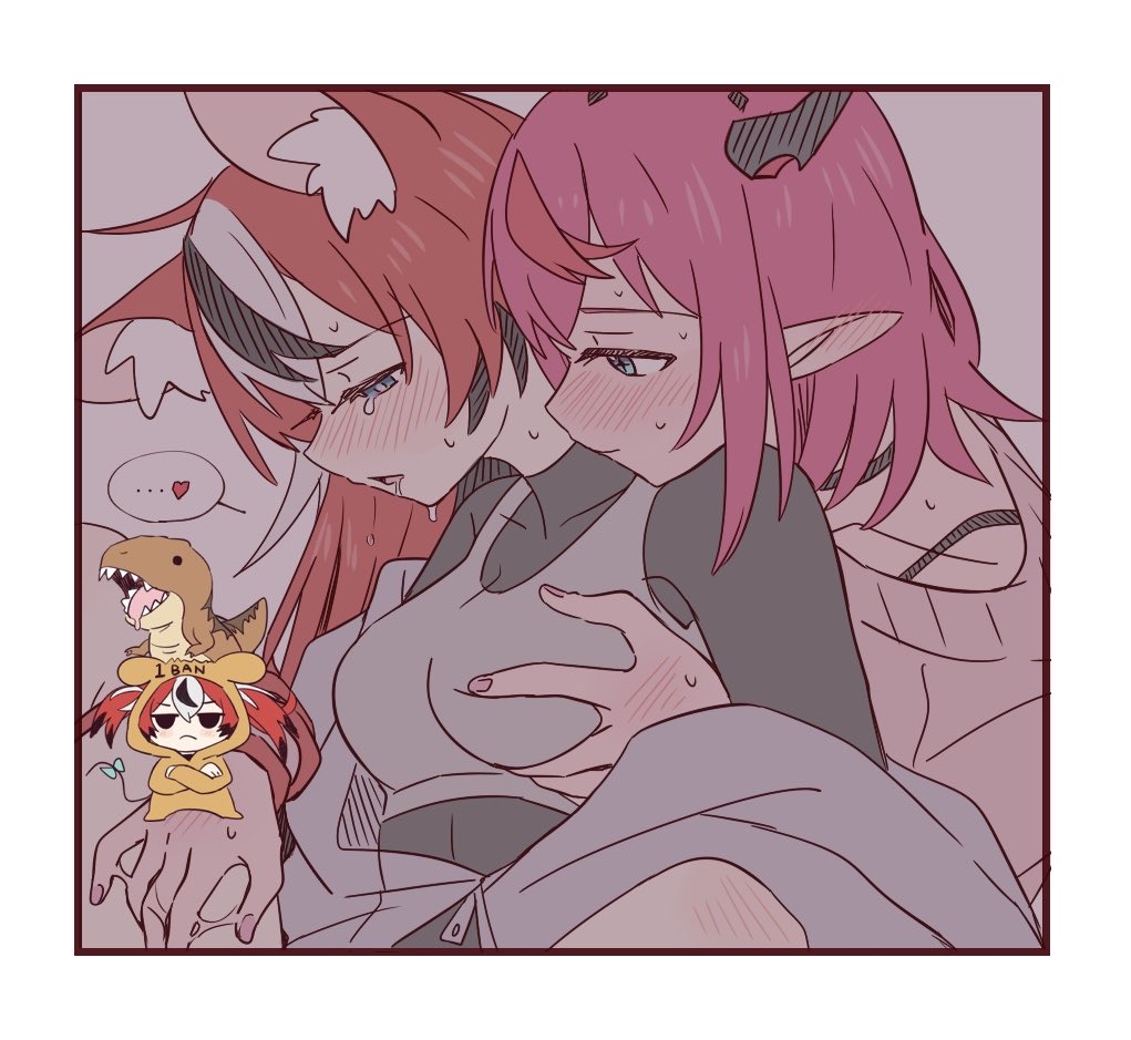 2girlsafter fingeringanimal ear fluffanimal earsblack chokerblack shirtblack streaksblue eyesblushbrachokercross-shaped pupilsdinosaurgrabbing another's breastgrabbing from behindgrey bragropinghearthornslong hairmouse earsmultiple girlspink hairpointy earspussy juicepussy juice on fingersred hairshirtspoken heartsweatsymbol-shaped pupilstearsunderwearvirtual youtuberwhite streaksyuri