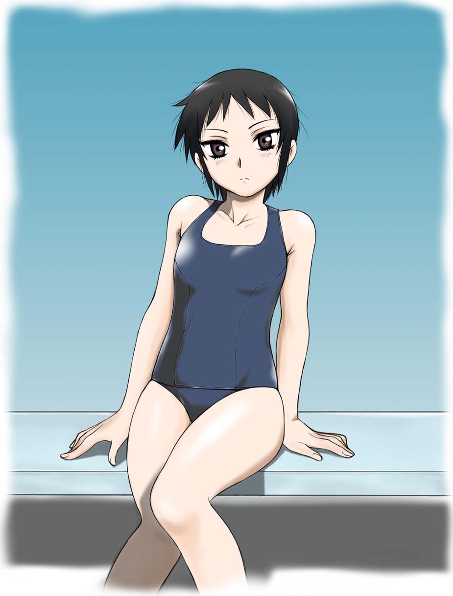 00sbare shouldersblack hairflat chestone-piece swimsuitpurple eyesschool swimsuitshort hairsittingsoloswimsuit