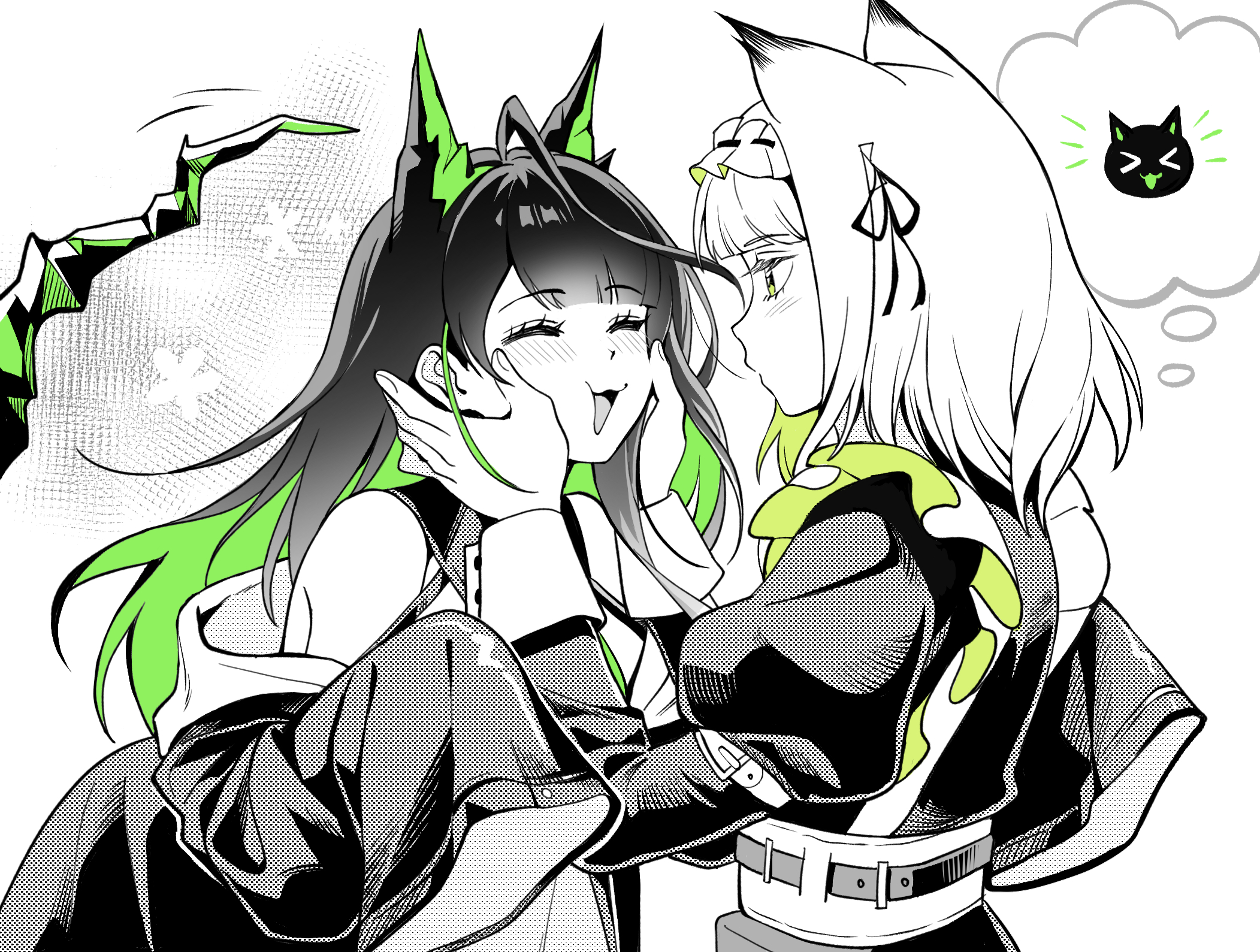 :d1boy2girlsahogeanimal earsbare shouldersblushclosed eyescolored inner hairfacing anothergreen hairhands on another's cheekshands on another's facehuge ahogejuliet sleeveslong hairlong sleevesmaidmulticolored hairmultiple girlsoff shoulderofficial alternate costumeopen mouthpartially coloredprofilepuffy sleevesshort hairsmilespeech bubblethought bubble