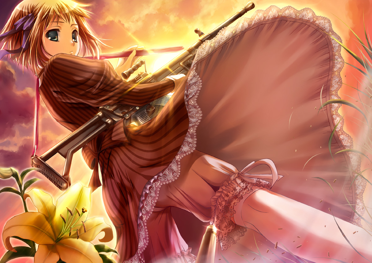 00s1girlblonde hairbloomersdressdutch angleeveningfemale focusflowerfrillsfrom abovefrom belowgrassgreen eyesgunhair ribbonkneehighslacelily (flower)lingeriemachine gunpetticoatribbonshort hairskysockssolosunsettwilightunderwearweaponwindwind lift