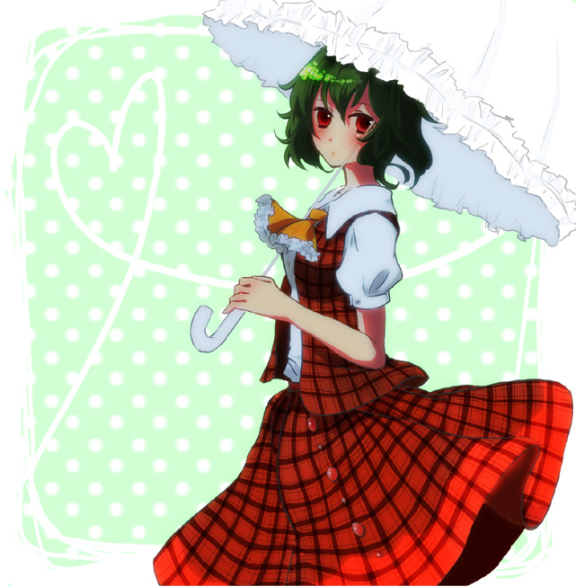 1girlascotblushdairy (pixiv227834)female focusgreen hairheartheart of stringparasolplaid clothesplaid skirtplaid vestpolka dotred eyesshort hairskirtskirt setsoloumbrellavest