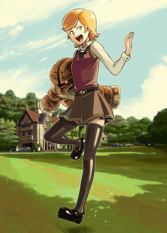 beltcarclouddaygrassgreen eyeshousemary janesmotor vehicleopen mouthorange hairshoesshort hairskirtskysolostuffed toysweater vestthighhighstree