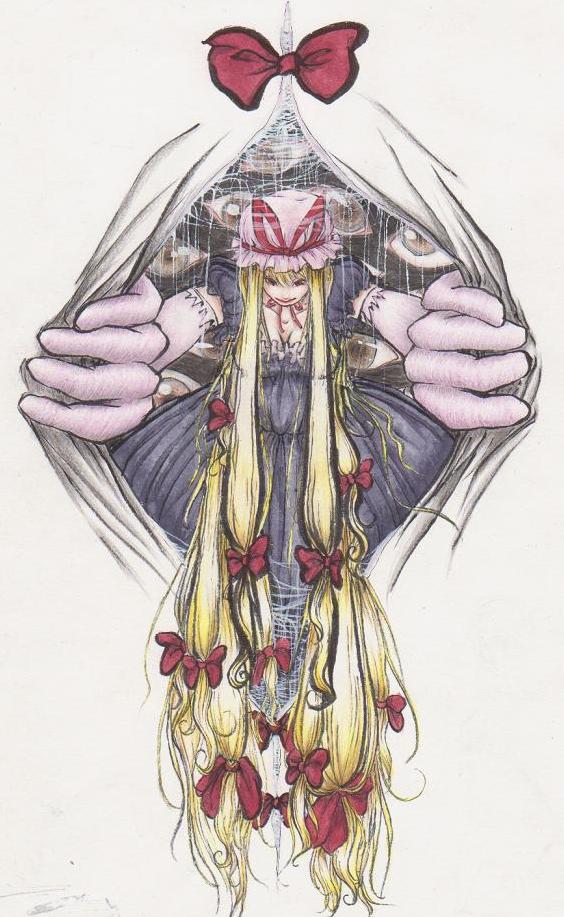 1girlblonde hairbowbreastscleavagedresselbow glovesfemale focusgap (touhou)glovesgoatsehair bowhatlong hairred eyessolovery long hair