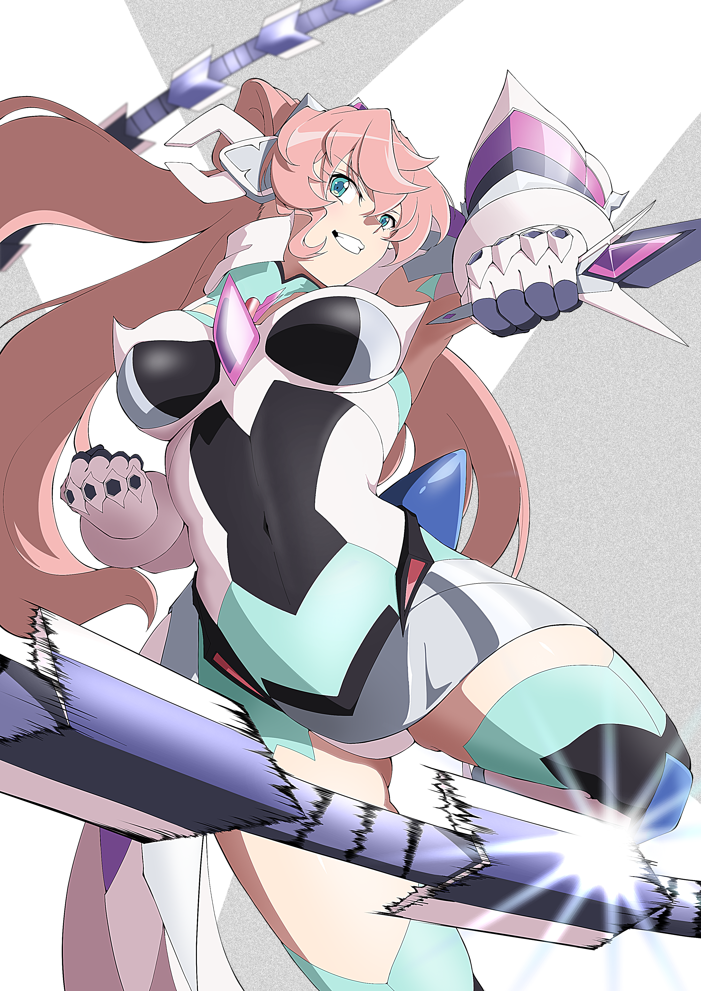 1girlarmorblushbreastsgreen eyeshair between eyesheadgearlong hairopen mouthpink hairpower armorsmilesolovery long hairweaponwhip sword