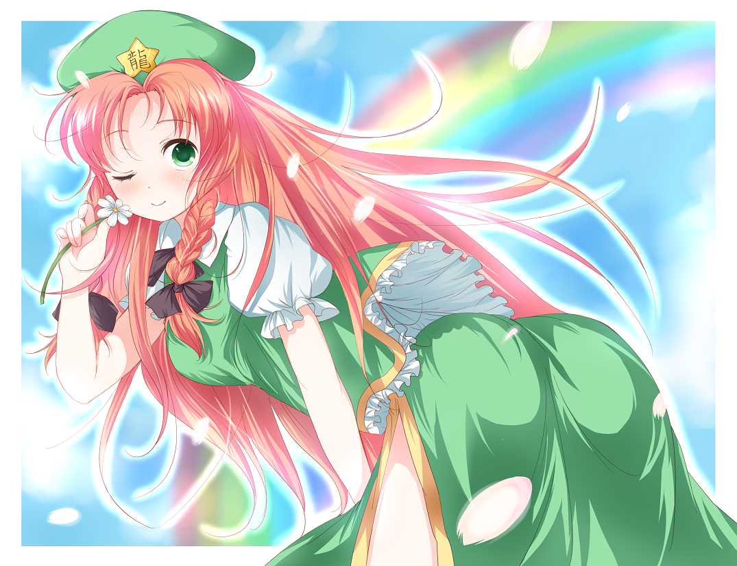 1girlassbent overberetbraidfemale focusflowergreen eyeshatlong hairlooking backpetalsrainbowred hairsolotwin braidsvery long hairwink
