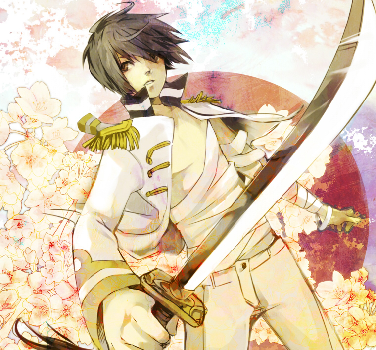 00s1boybandagesblack hairbrown eyescherry blossomsepaulettesflowerjapankatanamale focusmilitarymilitary uniformopen clothesopen shirtshirtshort hairsoloswordweapon