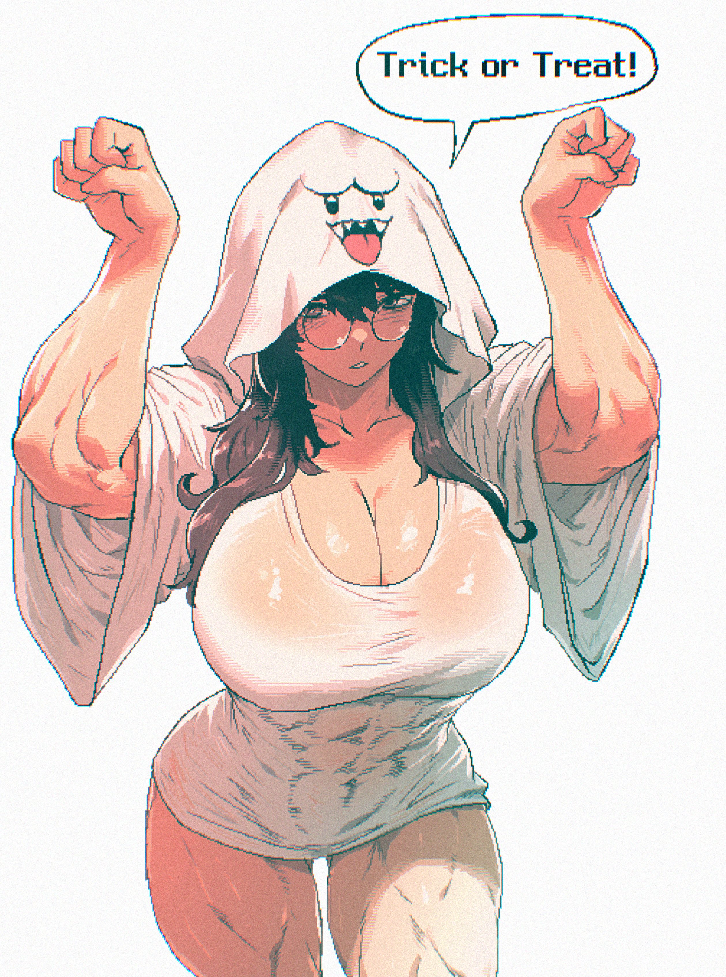 1girlarms upbare legsbreastsbrown eyesbrown haircharacter printcleavage cutoutclothing cutoutcollarbonecovered abscurvyenglish textghost costumeglasseshair between eyeshalloweenhalloween costumehoodhood uphuge breastslong hairlooking at viewermuscularmuscular femaleshirtspeech bubblewhite backgroundwhite shirtwide sleeves