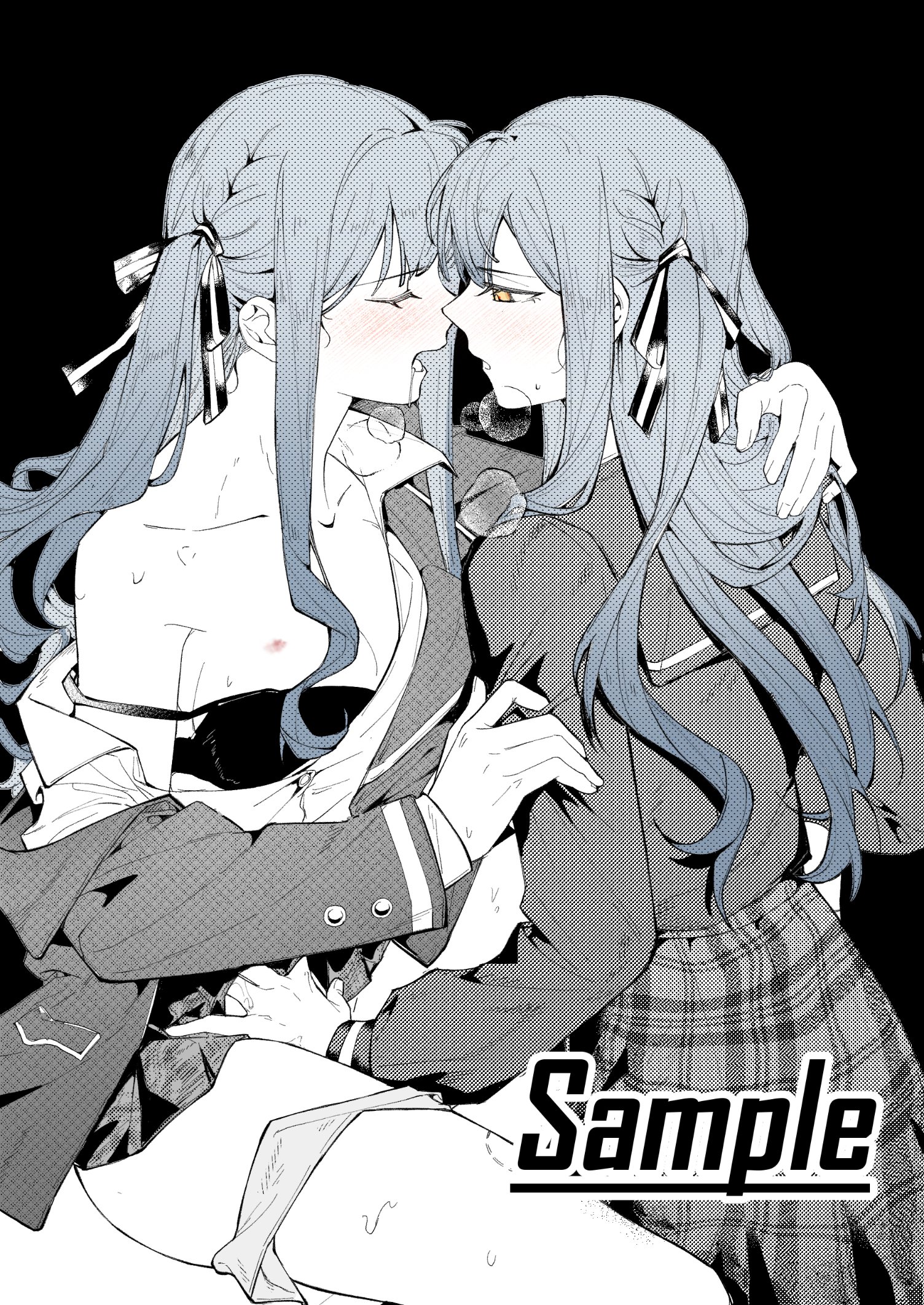 2girlsblack backgroundblue hairblushclosed eyesdroolingdual personahair ribbonhand under clotheshand under skirthaneoka school uniformhickeylong hairmultiple girlsopen mouthpartially coloredplaid clothesplaid skirtribbonschool uniformselfcestsidelocksskirtstrap sliptsukinomori school uniformyellow eyesyuri
