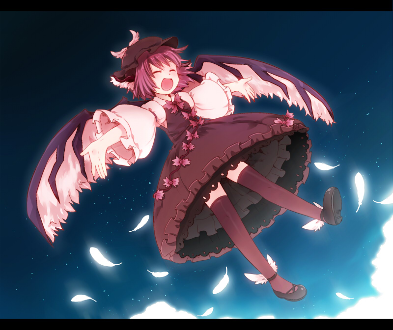 :d1girlanimal earsblack shoesclosed eyesdressfeathersfemale focusfull bodyhatlingerienightopen mouthoutdoorsoutstretched armspetticoatpink hairribbonshoesshort hairskysmilesolostar (sky)starry skythighhighsunderwearwings
