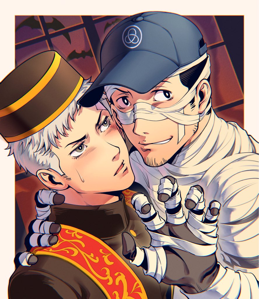 2boysbaseball capbat (animal)black hairblack jacketblue hatborderbright pupilsbrown hatclaw poseeyelashesfacial hairgoatee stubblegrey eyesgrey hairgrinhalloween costumehand on another's shoulderhatjacketmale focusmultiple boysmummy costumeshort hairsideburnssmilestubblewhite borderwhite pupilswindow