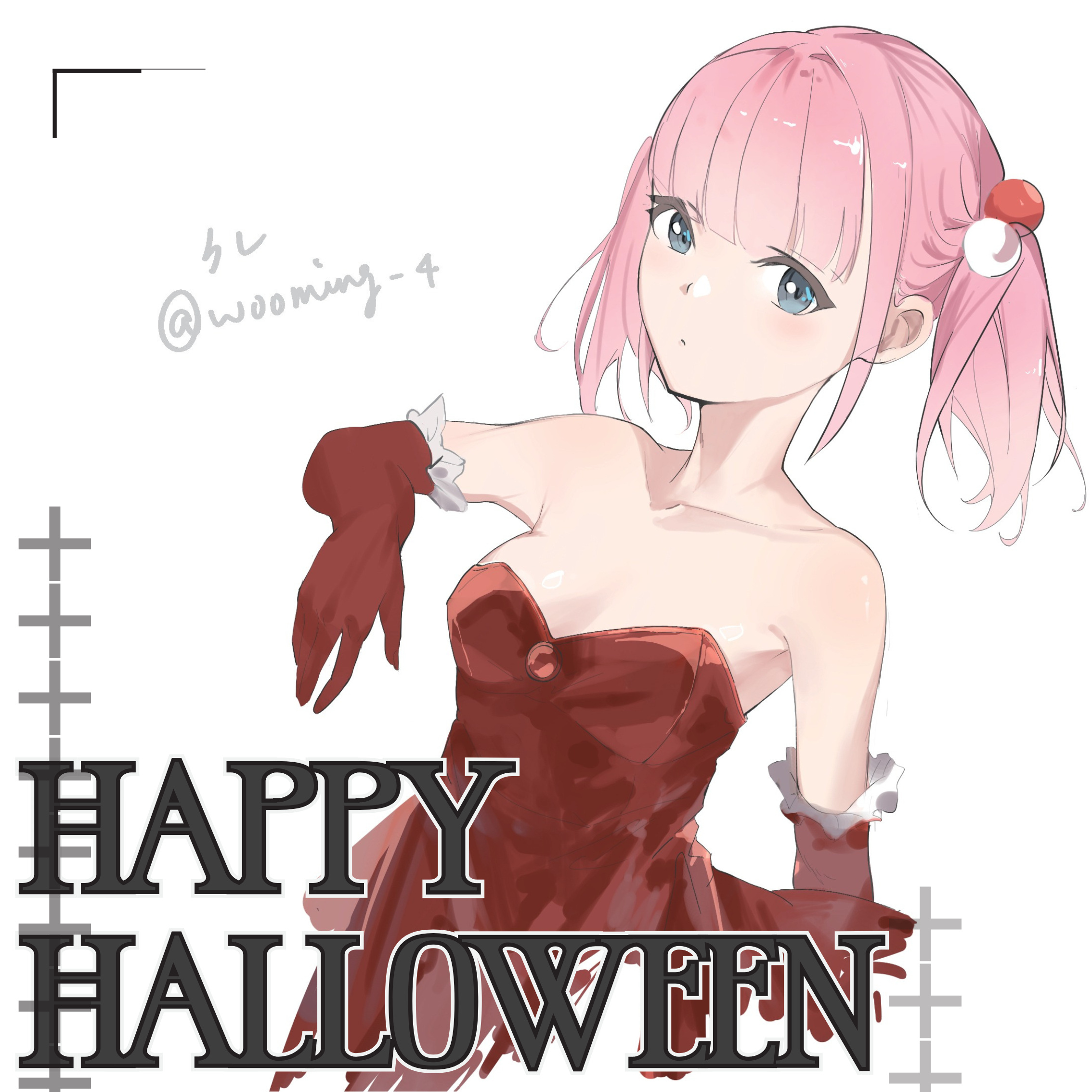 1girlbreastsclosed mouthdresselbow glovesglovesgrey eyeshappy halloweenkure (kuremnn)low twintailsmedium breastsmedium hairpink hairred dressred glovesshort twintailssolostraplessstrapless dresstwintailstwitter usernamewhite background