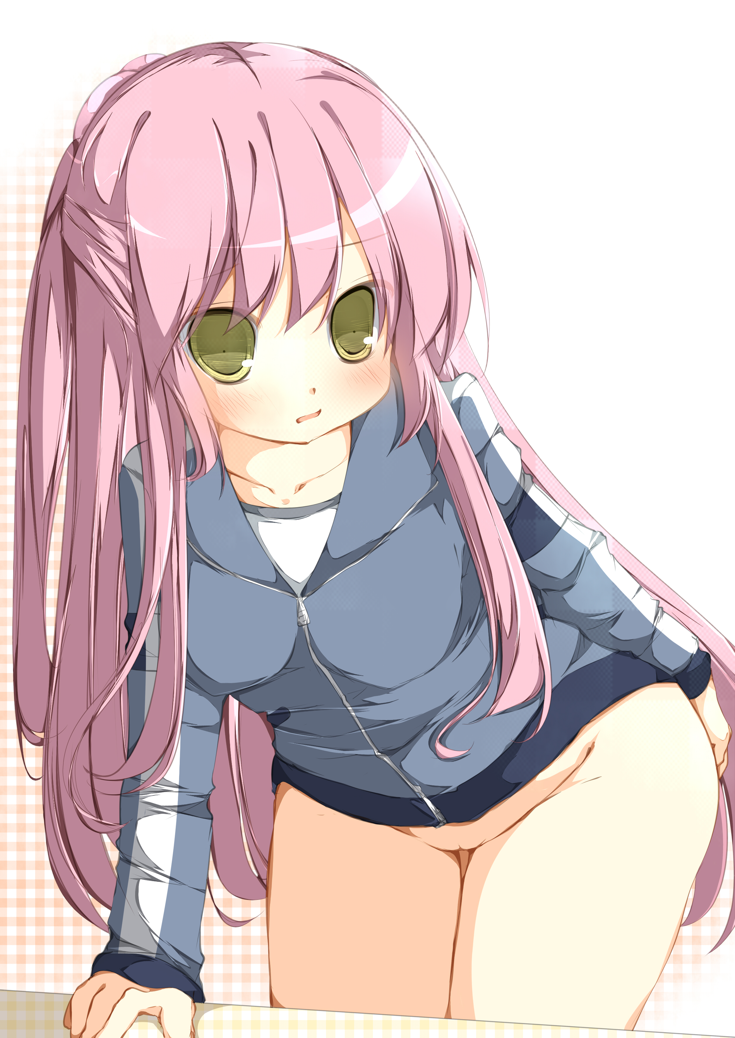 blushbottomlessbreastsbrown eyessfemaleFlag for Deletionhair bobbleshair ornamentjacketleaning forwardlong hairlooking at viewerpurple hairpussyside ponytailsolotrack jacketuncensored