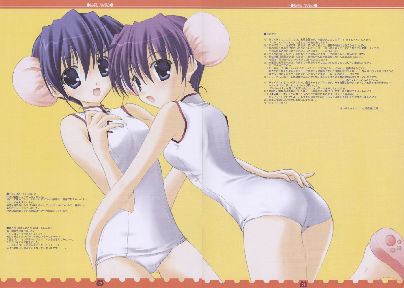 00s2girlsassblue eyesblue hairblushbreastsbun coverchinese clothesdouble bunhair bunhand on own chestleg uplooking to the sidemultiple girlsone-piece swimsuitopen mouthpurple hairshoessmall breastssmileswimsuitwhite one-piece swimsuityellow background