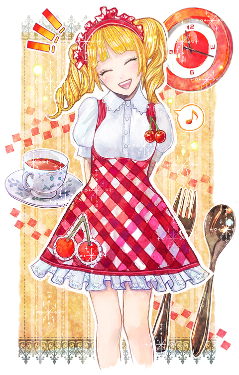 :d1boycherryclockclosed eyesfoodfood-themed clothesforkfruithead tiltmusical noteopen mouthskirtsmilesolosparklespoonteatwintailswaitress