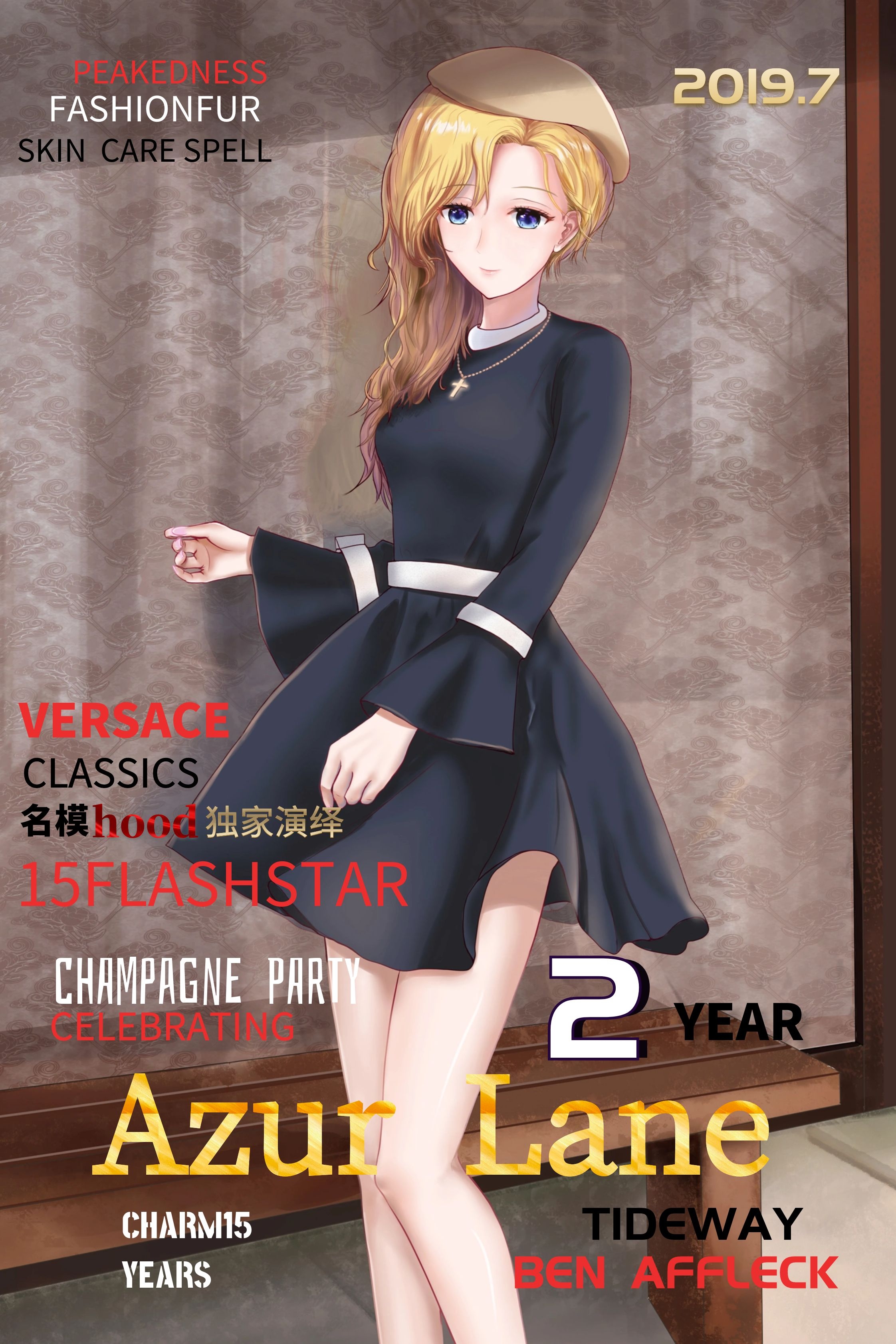 1girlalternate costumeberetblack dressblonde hairblue eyesbreastsbrown hatcasualchinese textcovercrosscross necklacedressenglish textfake magazine coverhair over shoulderhatjewelrylong hairlong sleevesmagazine covermedium breastsnecklacesolo