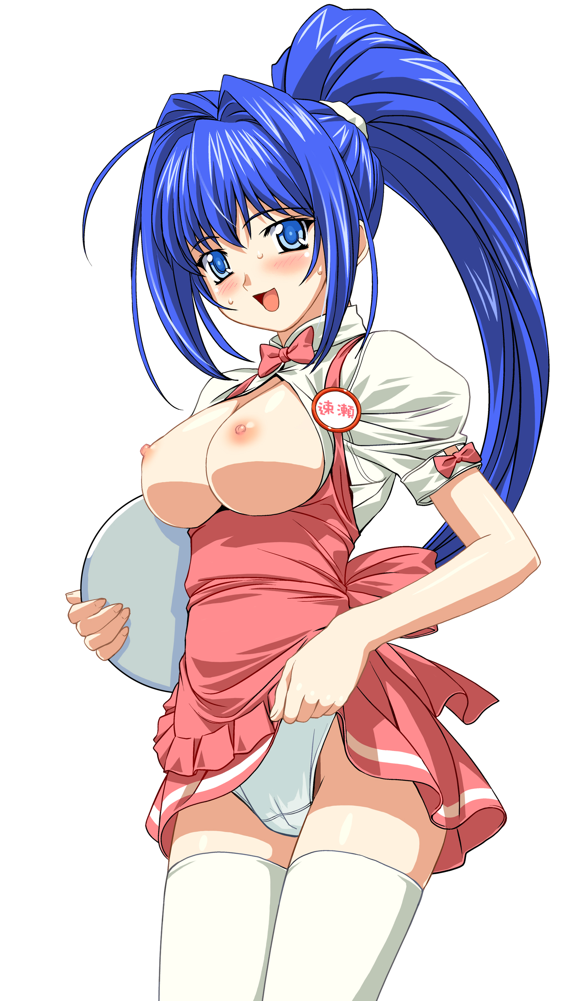 00s1girlblue eyesblue hairblushbowcameltoeclothes liftfemale focusmatching hair/eyesno braopen clothesopen mouthopen shirtpantiesponytailshirtsimple backgroundskirtskirt liftsmilesolothighhighsunderwearwaitresswhite background