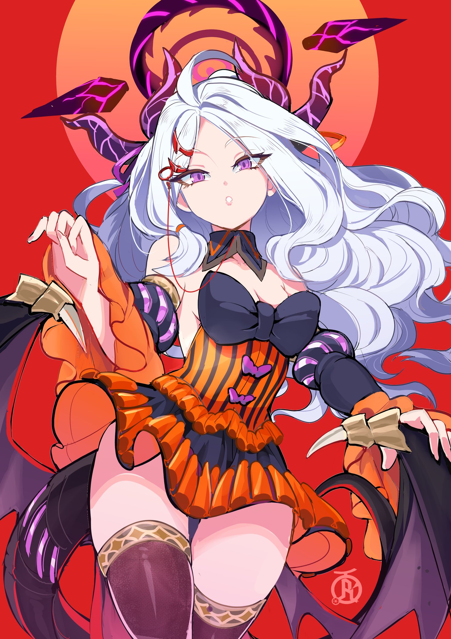1girlahogeblushbowbowtiebreastsdemon girldemon hornsdemon wingsdetached collarhair ornamenthalloweenhalloween costumehalohornslong hairlooking at viewerparted bangspurple eyessmall breastssolothighhighswhite hairwings