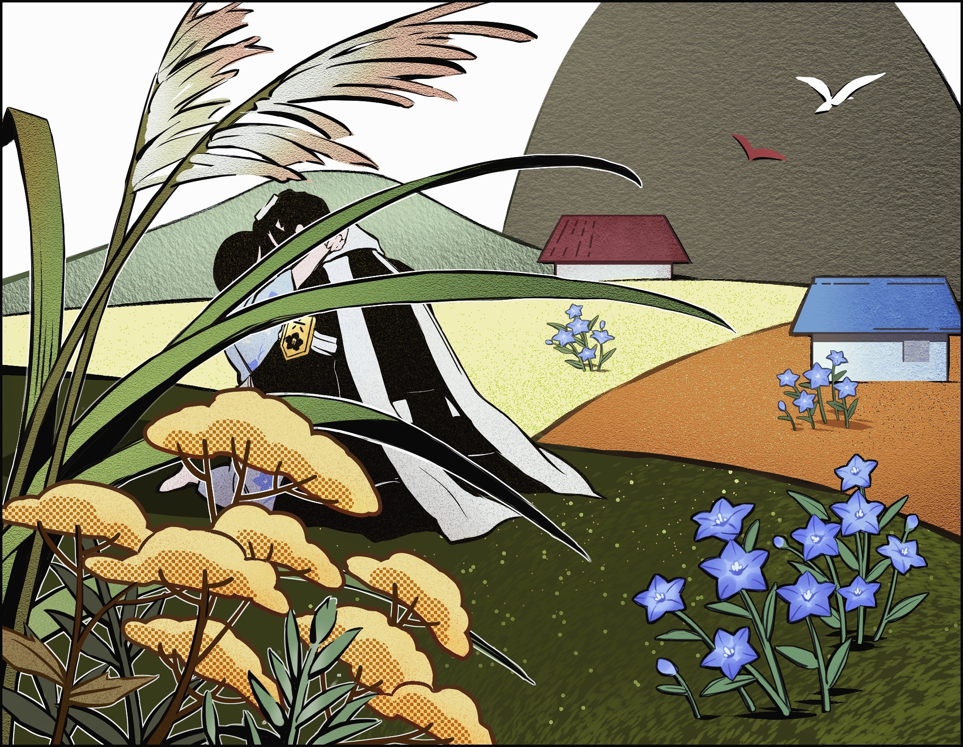 1boy1girlbirdblue kimonoflowerheterohousehusband and wifejapanese clotheskimonokissmountainplantscarfshihakushosittingwhite scarf