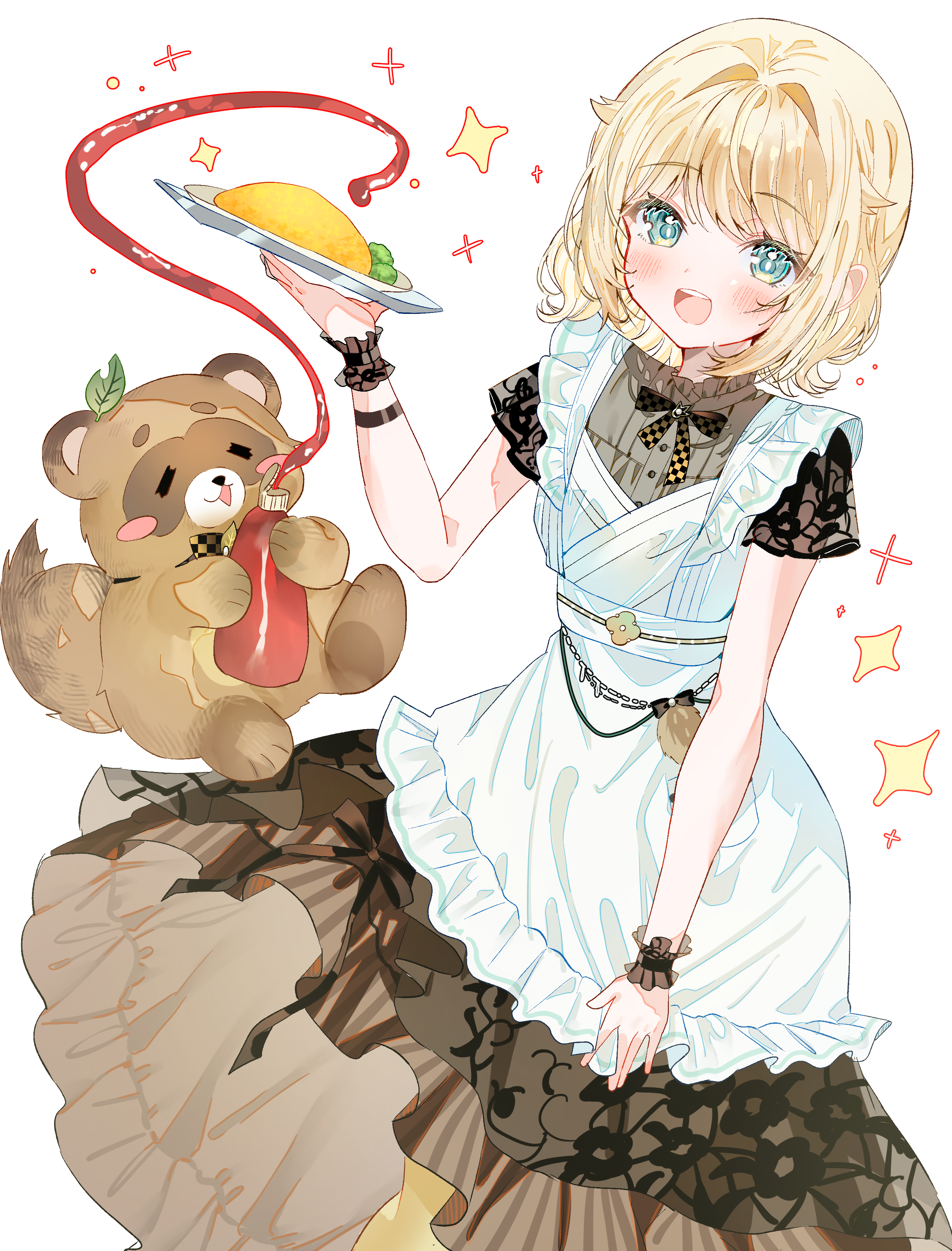 :d1girlapronaqua eyesblack dressblack sleevesblonde hairdressfoodfrilled apronfrillshair flapshair intakesholdingholding platekazama iroha (maid)ketchupketchup bottlelacelace sleeveslooking at viewermaid apronmedium hairneck ribbonofficial alternate costumeomeletomuriceopen mouthplateribbonsimple backgroundsmilesoloteethupper teeth onlywhite apronwhite backgroundwrist cuffs
