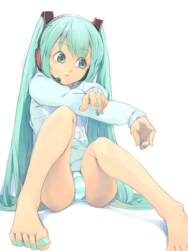 1girlaqua eyesaqua hairaqua nailsbarefootbottomlessfat monsfeetfemale focushair ornamentheadsetlong hairnail polishno pantspantiessittingsolospread legsstriped clothesstriped pantiessweatertoenail polishtoenailstwintailsunderwearvery long hair