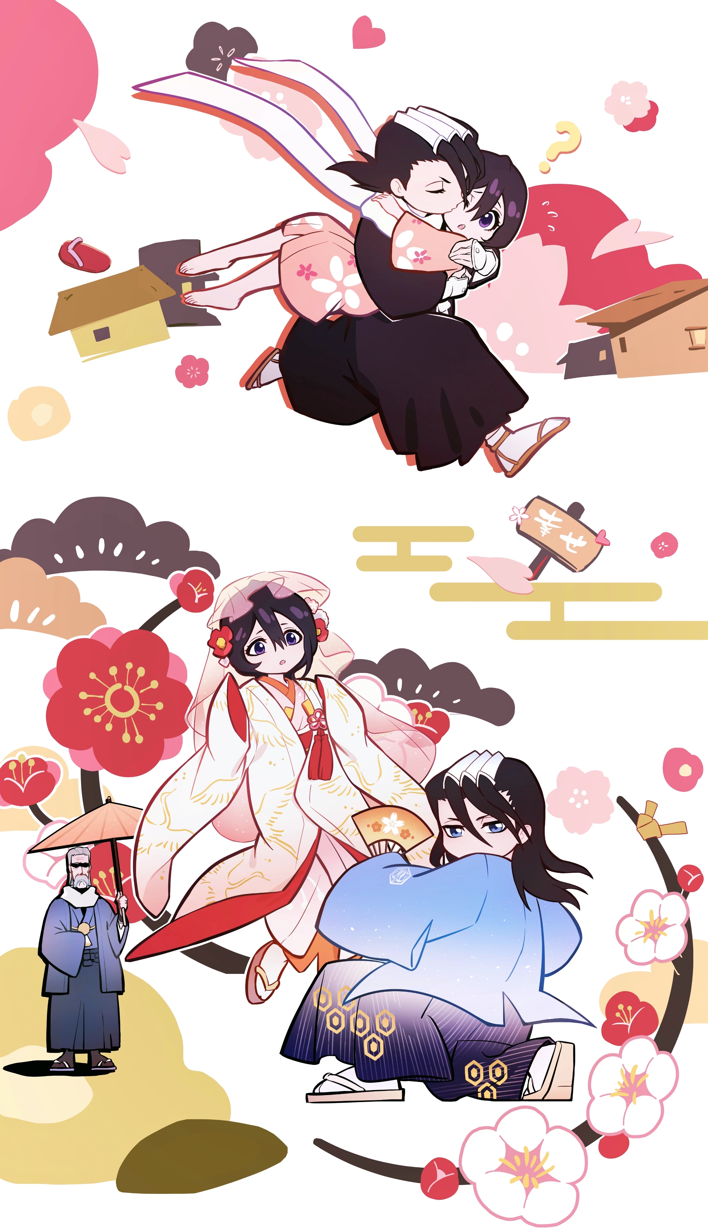 1boy1girl2boysbarefootblack hairblack hakamablack socksblue eyesfacial hairgrey hairhakamahand fanheteroholdingholding fanholding umbrellahusband and wifejapanese clotheskimonokisskissing cheekmultiple boysmustacheoil-paper umbrellaoldold manpetalspurple eyessandalsshort kimonosignsleeves past fingerssleeves past wristssocksuchikakeumbrellaunworn sandalswhite socks