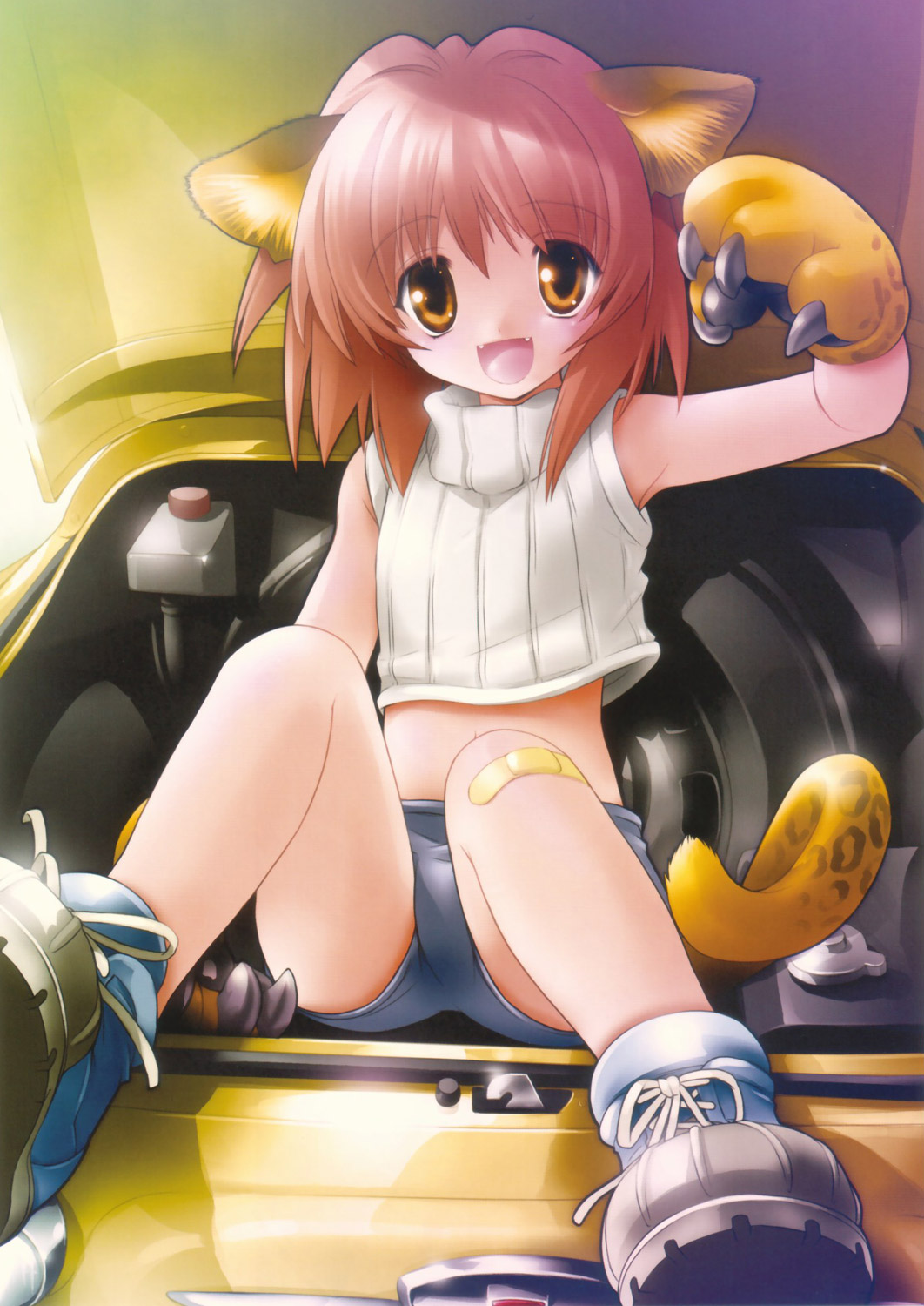 1girlanimal earsanimal handsbandaidbandaid on kneebandaid on legbare armsbare shouldersblushbrown eyesbrown haircarcar trunkcat earscat tailchildfacing viewerfangfangsfemale focusfiat 500gloveshappyin trunklooking at viewermidriffmotor vehiclepaw glovesred hairshoesshort hairshortssittingsleevelesssmilesneakerssolospare tiretailtank topunused tireyellow eyes