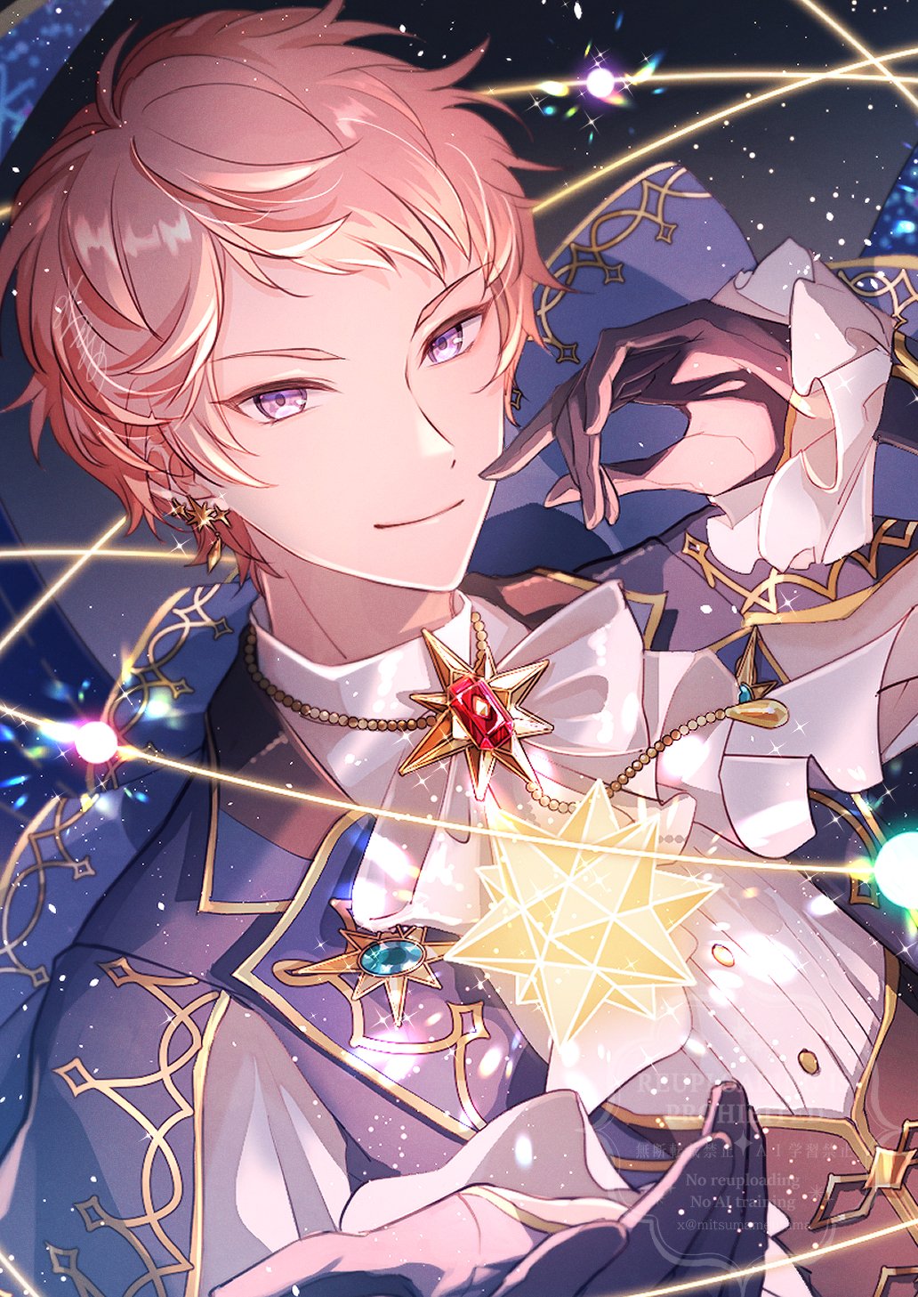 1boyblack glovesclosed mouthearringsgloveshands uphoshi no meidou (ensemble stars!)jewelrylapelslayered clotheslong sleeveslooking at viewermale focusmitsumame (mitsumamentama)notched lapelsofficial alternate costumeoutstretched handpink hairpurple eyesshort bangsshort hairsmilesoloupper body